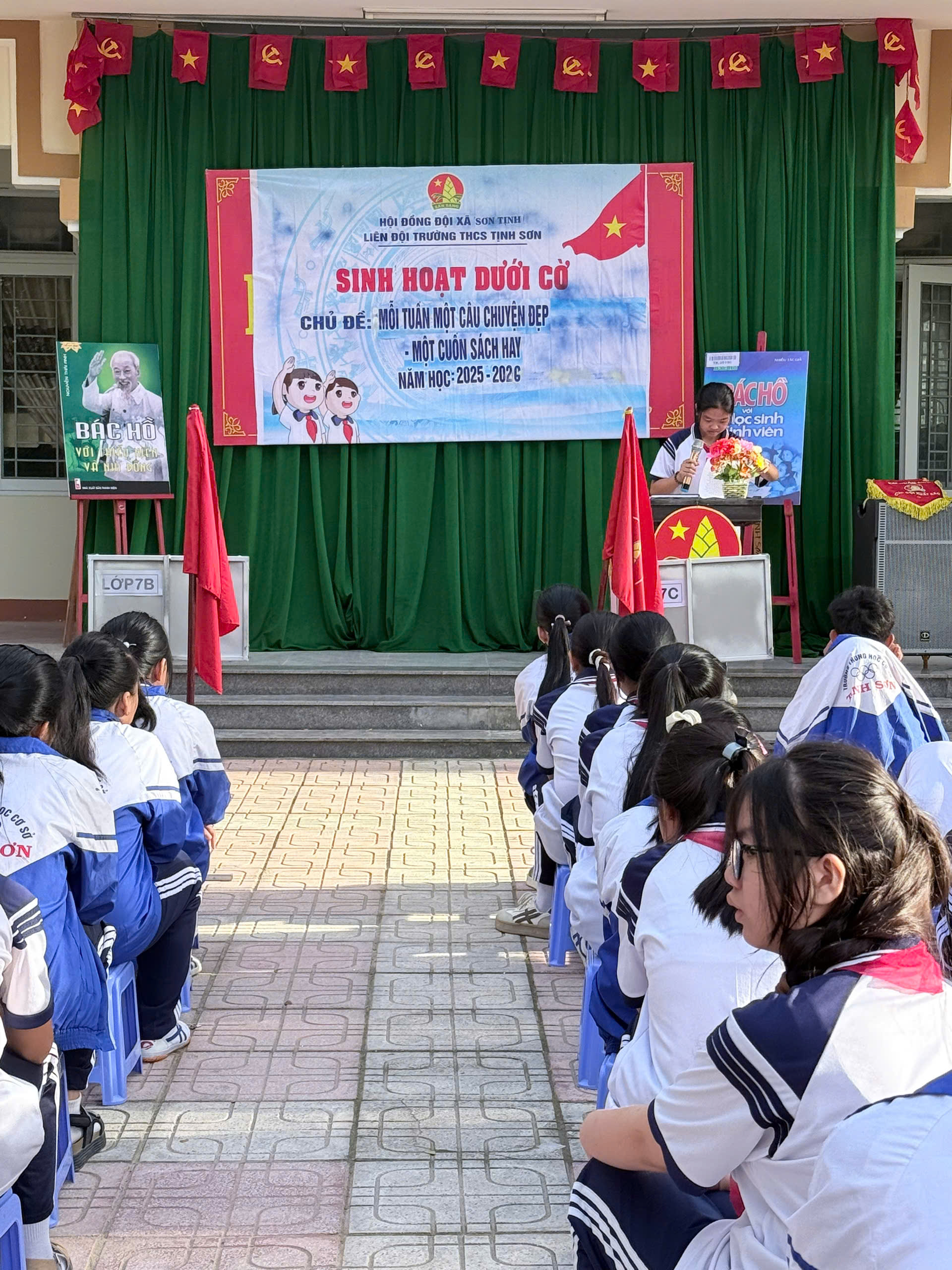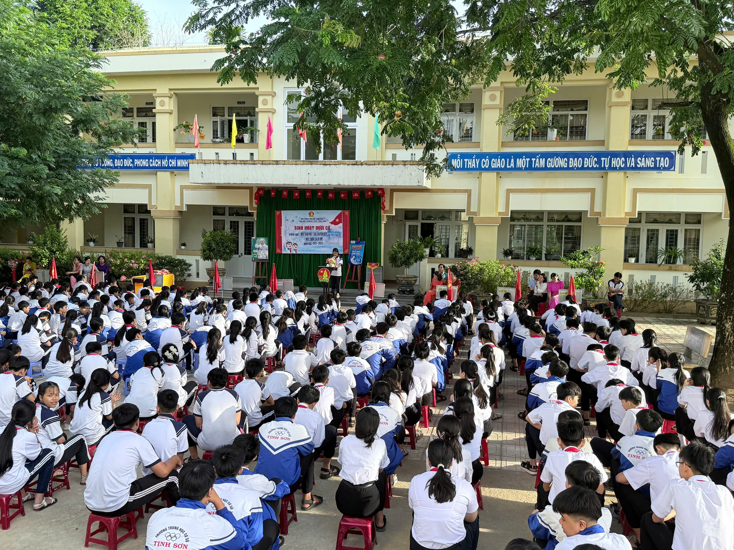Sáng nay (06//10/2025), Trường THCS Tịnh Sơn tổ chức hoạt động sinh hoạt dưới cờ với chủ đề: “Mỗi tuần một câu chuyện đẹp, một cuốn sách hay”. Tham dự hoạt động có đại diện BGH, quý thầy cô GVCN, thầy TPT Đội và 386 học sinh trong toàn trường. Với hoạt động ý nghĩa này, các em sẽ nhận thức đầy đủ hơn về vai trò của sách trong quá trình chiếm lĩnh tri thức; đồng thời giáo dục ý thức tự học, tự đọc sách, nâng cao văn hóa đọc trong Nhà trường. Đầu tuần mới, kính chúc quý thầy cô cùng các em luôn tràn đầy năng lượng và có một tuần hoàn thành tốt nhất nhiệm vụ của mình.